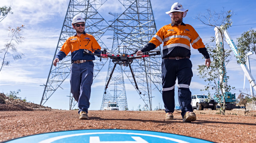 Powerlink Chief Executive Paul Simshauser said using the drone to string the new 85 metre tall transmission towers was a first for Powerlink and highlighted the diverse skills of its workforce.