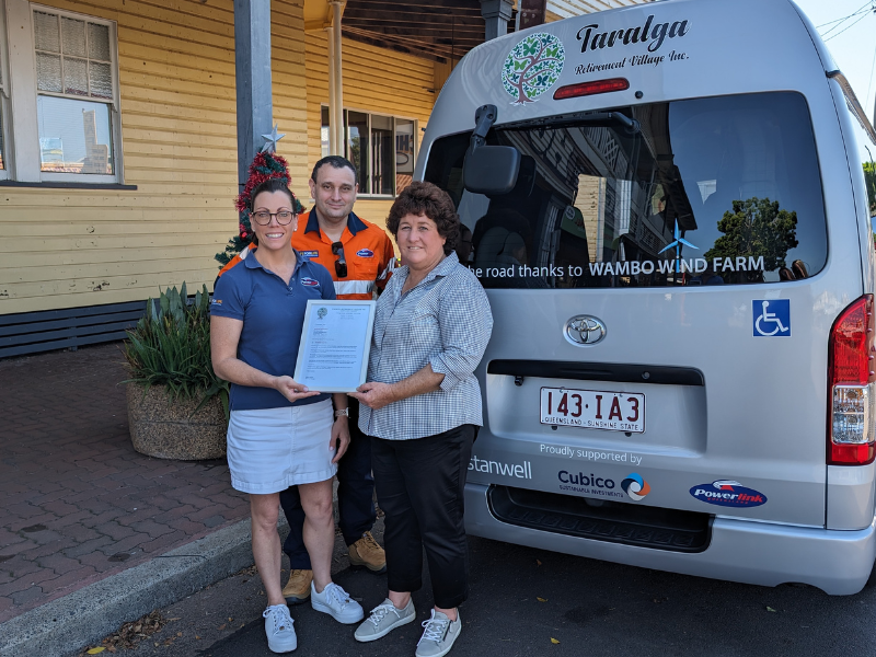 Alongside Stanwell, Vestas and Cubico Sustainable Investments, we were excited to co-sponsor Taralga Retirement Village’s new van to transport their residents and National Disability Insurance Scheme (NDIS) clients to medical, allied health and community access services in Jandowae, Dalby and much further afield as required.